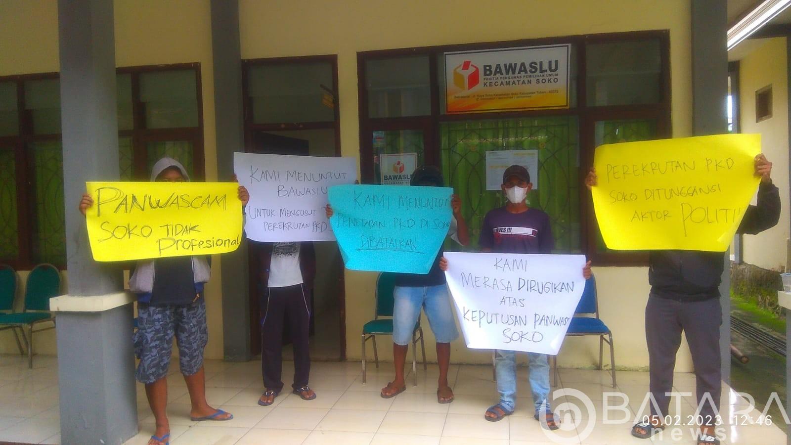 Hasyim, Koordinator unjuk rasa dalam aksinya juga menyampaikan penolakannya terhadap penetapan hasil seleksi PKD yang dilakukan oleh Panwaslu kecamatan Soko, karena dianggap tidak profesional dan ada indikasi campur tangan dari oknum anggota partai politik.