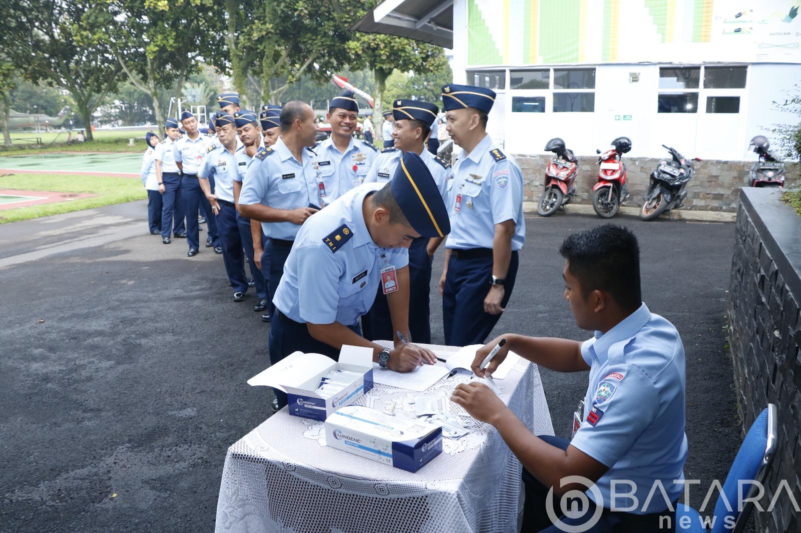 Bandung-Koharmatau. Personel militer dan Pegawai Negeri Sipil (PNS) Komando Pemeliharaan Materiel TNI Angkatan Udara (Koharmatau) melaksanakan swab antigen di Gedung Budiardjo Makoharmatau sebagai langkah antisipasi penularan Covid-19 pasca pelaksanaan libur Idul Fitri 1444 H/ 2023 M. Rabu (26/4/2023).