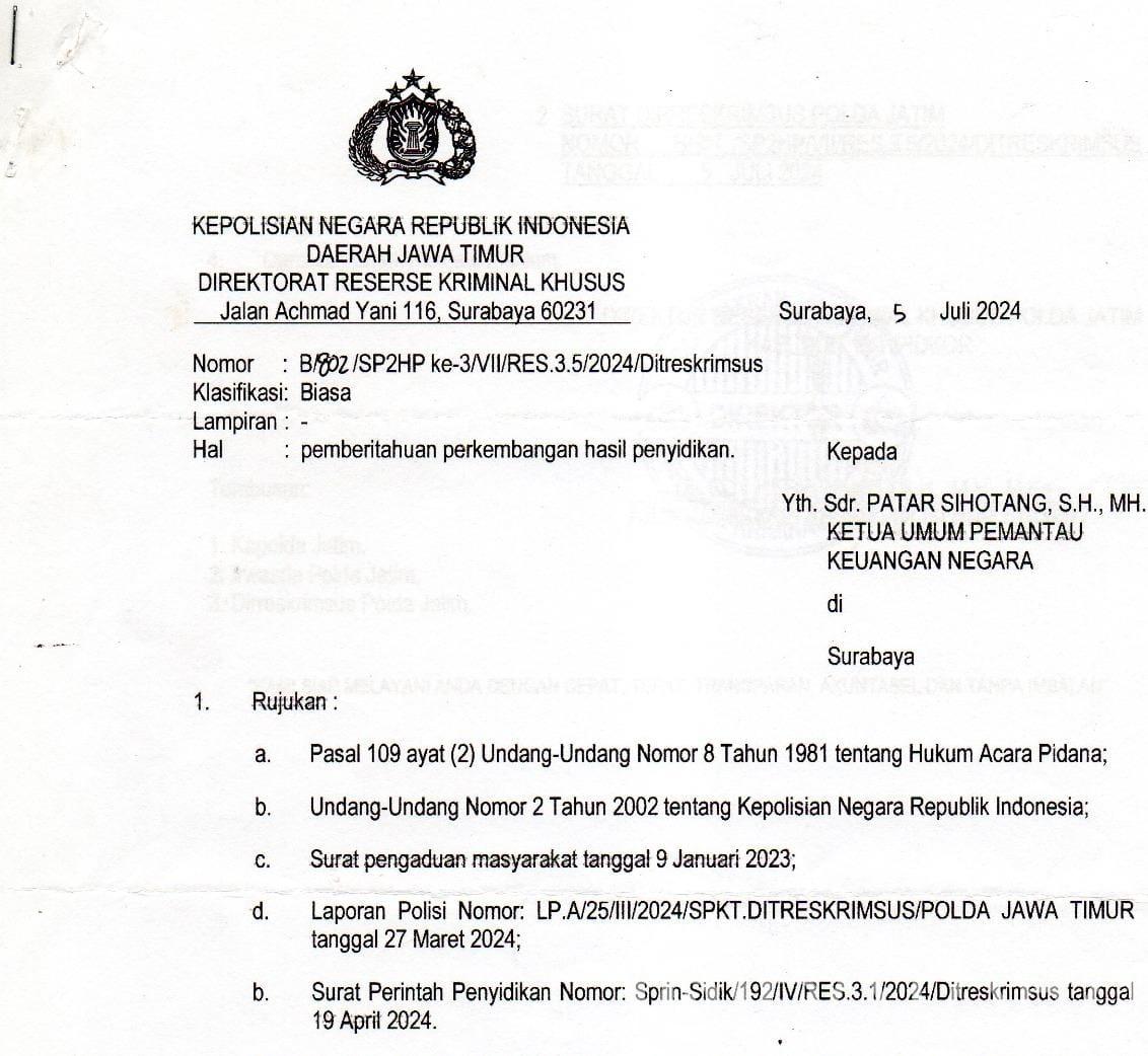 berdasarkan Laporan tersebut Kami Pemantau Keuangan negara telah di panggil beberapa kali untuk memberikan keterangan dan dokumen terkait laporan dan kami juga sudah di kirim beberapa kali SP2HP dari Dirkrimsus Polda jawa Timur .
