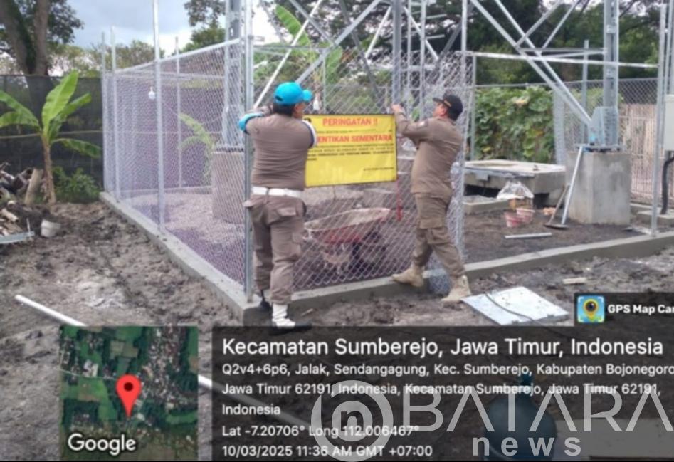 Menurut Dian Rokhmawati, Camat Sumberrejo, tim teknis dari Dinas Perijinan dan Satuan Polisi Pamong Praja (Satpol PP) Kabupaten Bojonegoro melakukan peninjauan ke lokasi pada Senin (10/03/2025) untuk melakukan penyegelan pembangunan Tower telekomunikasi yang berdiri didesa Sendang Agung Sumberrejo.