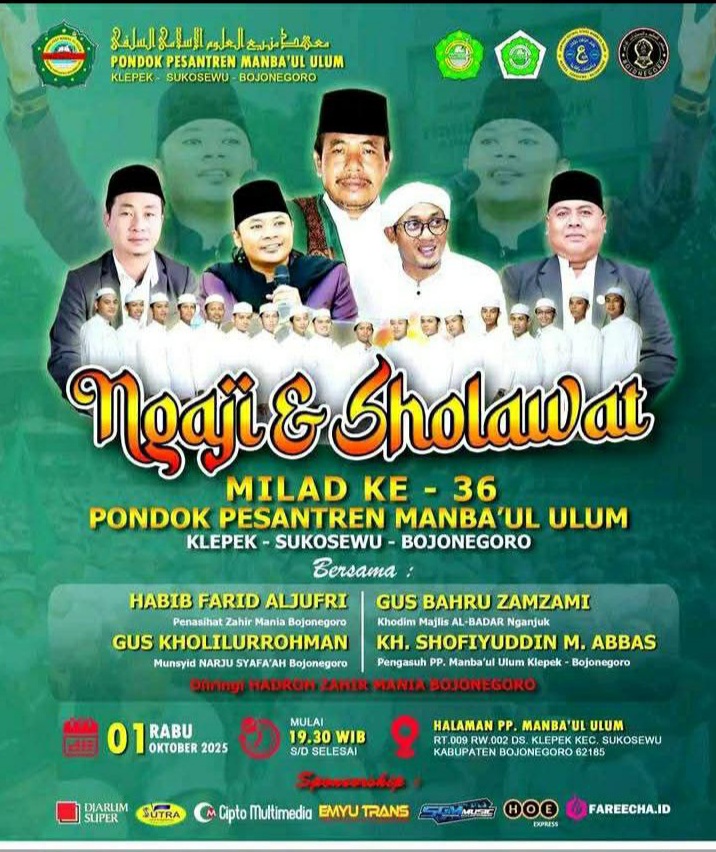Bojonegoro,-Batara.news – Pondok Pesantren Mamba’ul Ulum, Desa Klepek, Kecamatan Sukosewu, Kabupaten Bojonegoro, akan menyelenggarakan peringatan Milad ke-36 pada Rabu (1/10/2025) malam. Kegiatan tersebut dikemas dalam bentuk Ngaji dan Sholawat yang akan dipusatkan di halaman pondok, RT 009/RW 002, mulai pukul 19.30 WIB.