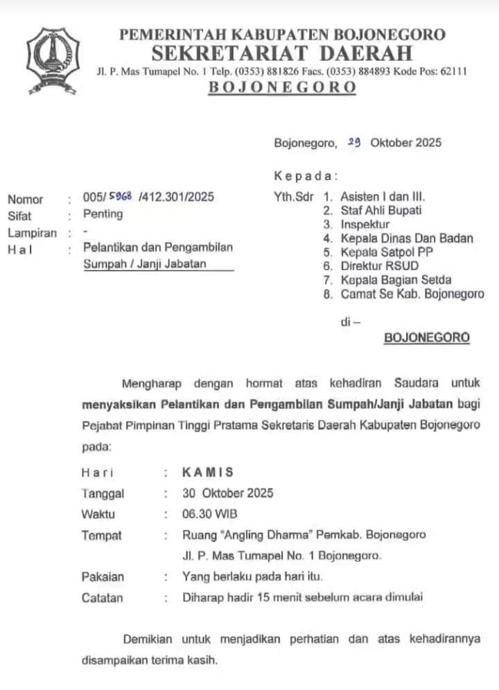 Pemerintah Kabupaten Bojonegoro dijadwalkan melantik Sekretaris Daerah (Sekda) baru, Edi Siswanto, yang sebelumnya menjabat sebagai Sekretaris DPRD Bojonegoro. Prosesi pelantikan digelar besok, Kamis (30/10/2025) pagi, di Ruang Angkling Dharmo.