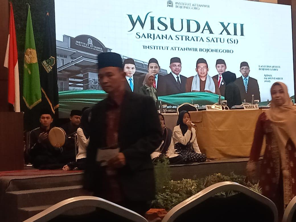 Di layar utama terpampang jelas tema acara “Wisuda XII Sarjana Strata Satu Institut Attanwir Bojonegoro” beserta jajaran pimpinan kampus. Para wisudawan satu per satu maju ke podium untuk dikukuhkan secara resmi sebagai sarjana.