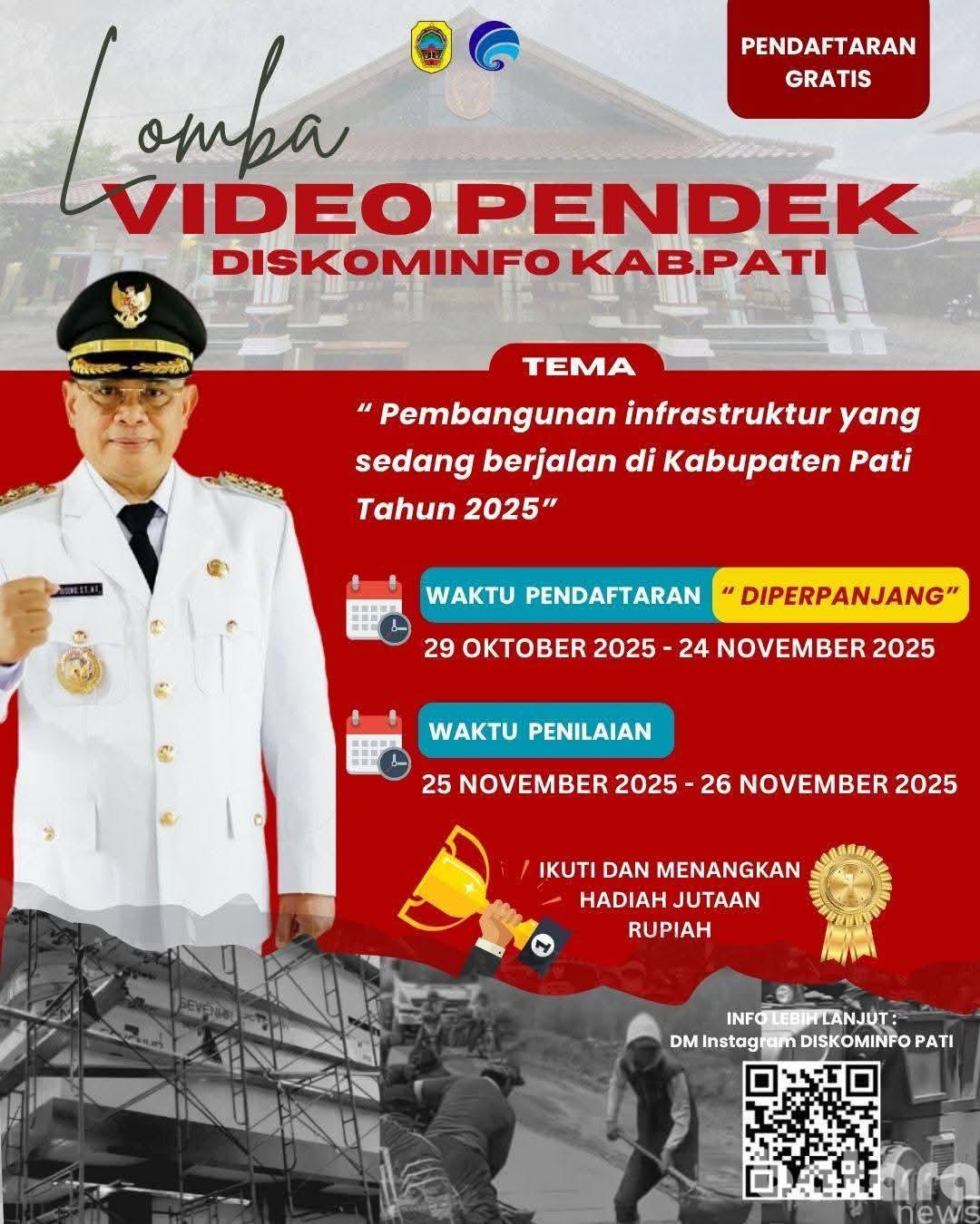 Pati, Batara.news || 10 November 2025 – Dinas Komunikasi dan Informatika (Diskominfo) Kabupaten Pati kembali mengajak masyarakat terlibat aktif dalam menyebarkan informasi pembangunan daerah. Melalui Lomba Video Pendek bertema “Pembangunan Infrastruktur yang Sedang Berjalan di Kabupaten Pati Tahun 2025”, ajang ini sekaligus menjadi ruang kreativitas bagi para konten kreator lokal.
