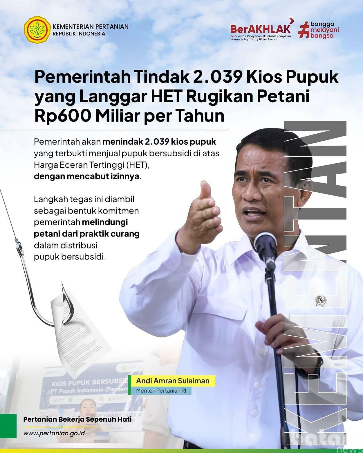 JAKARTA — Kementerian Pertanian (Kementan) mencabut izin sebanyak 2.039 kios pupuk bersubsidi yang terbukti menjual di atas Harga Eceran Tertinggi (HET). Langkah tegas ini diambil sebagai upaya melindungi petani dari potensi kerugian besar yang diperkirakan mencapai Rp600 miliar per tahun.