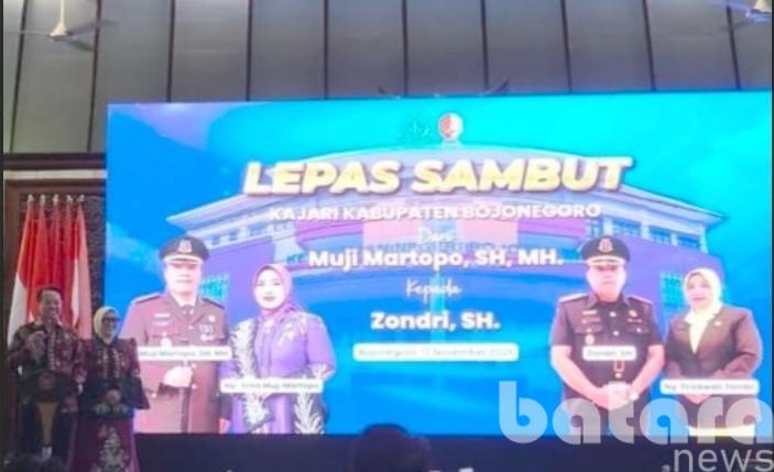 BOJONEGORO, Batara.news — Tongkat komando Kejaksaan Negeri (Kejari) Bojonegoro resmi berganti. Zondri, S.H., secara sah menggantikan Muji Martopo, S.H., M.Hum., melalui prosesi lepas sambut yang digelar di Pendopo Malowopati, Senin (17/11/2025). Suasana hangat namun penuh formalitas mengiringi transisi pimpinan korps Adhyaksa di bumi Angling Dharma tersebut.