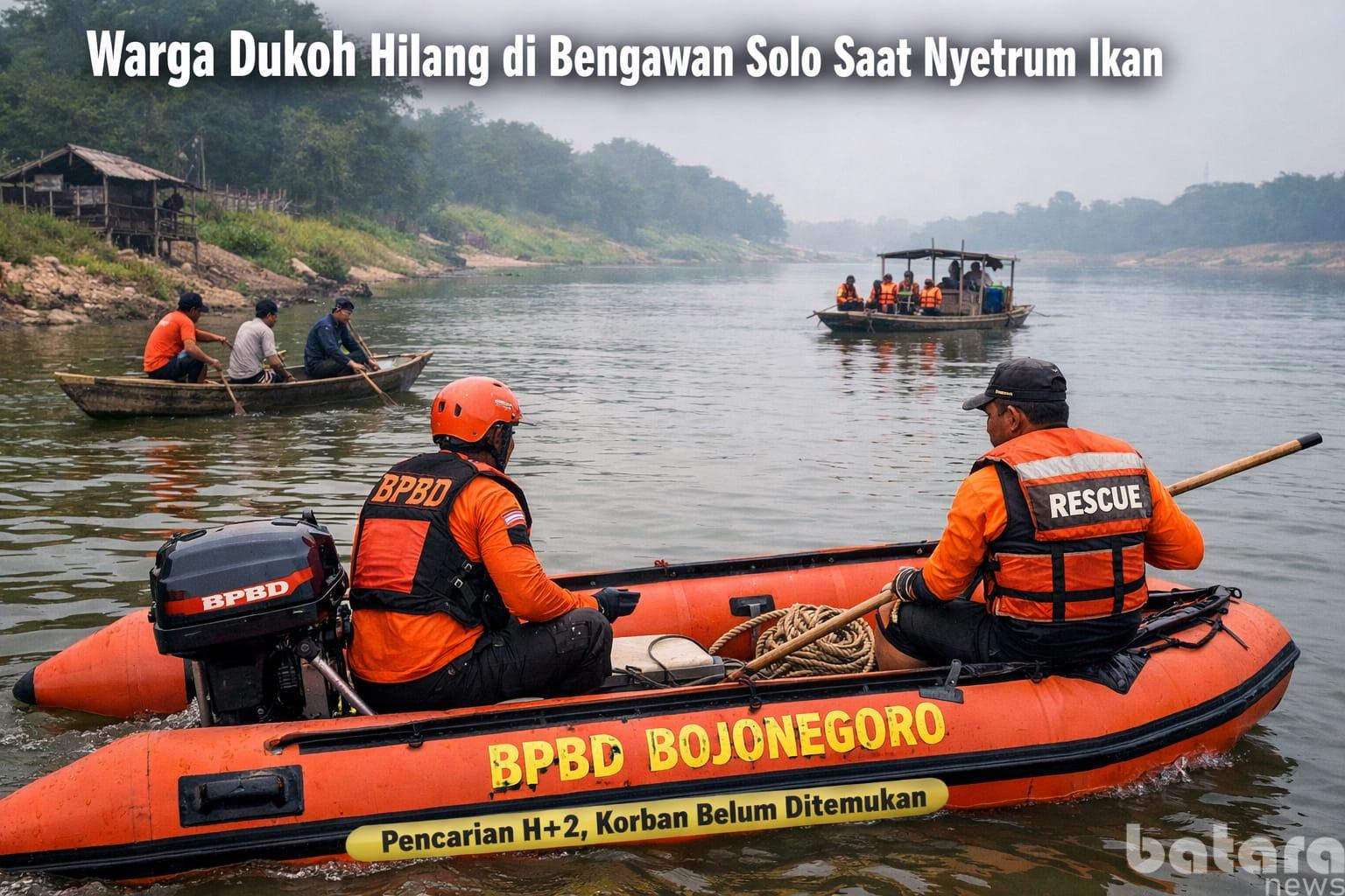 Hingga hari kedua (H+2) pencarian, korban masih belum ditemukan dan tim gabungan masih terus melakukan upaya pencarian di sepanjang aliran Sungai Bengawan Solo.
