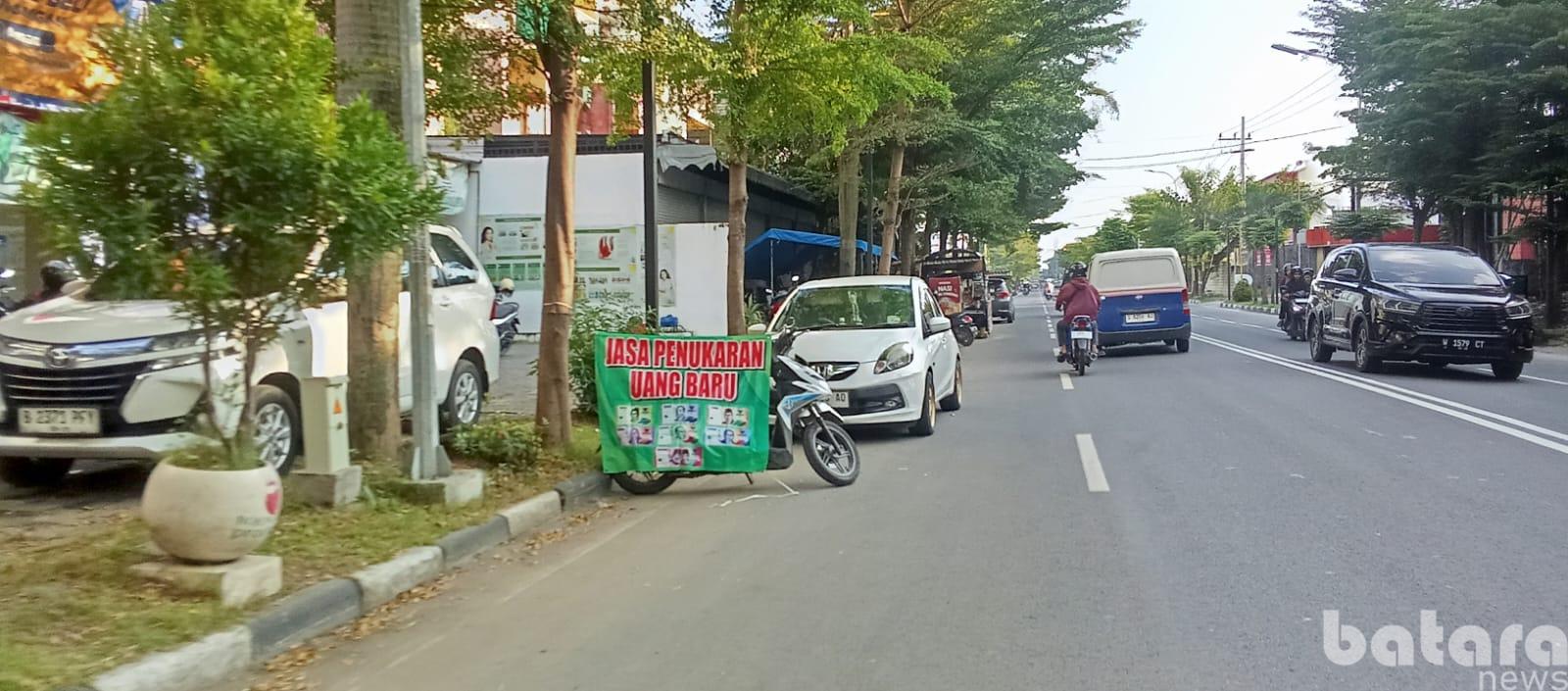Dari kejauhan, deretan mobil dan sepeda motor yang berhenti di bahu jalan dengan spanduk besar bertuliskan “Jasa Penukaran Uang Baru” terlihat berjajar rapat hampir tanpa jeda.kamis(12/3/2026)