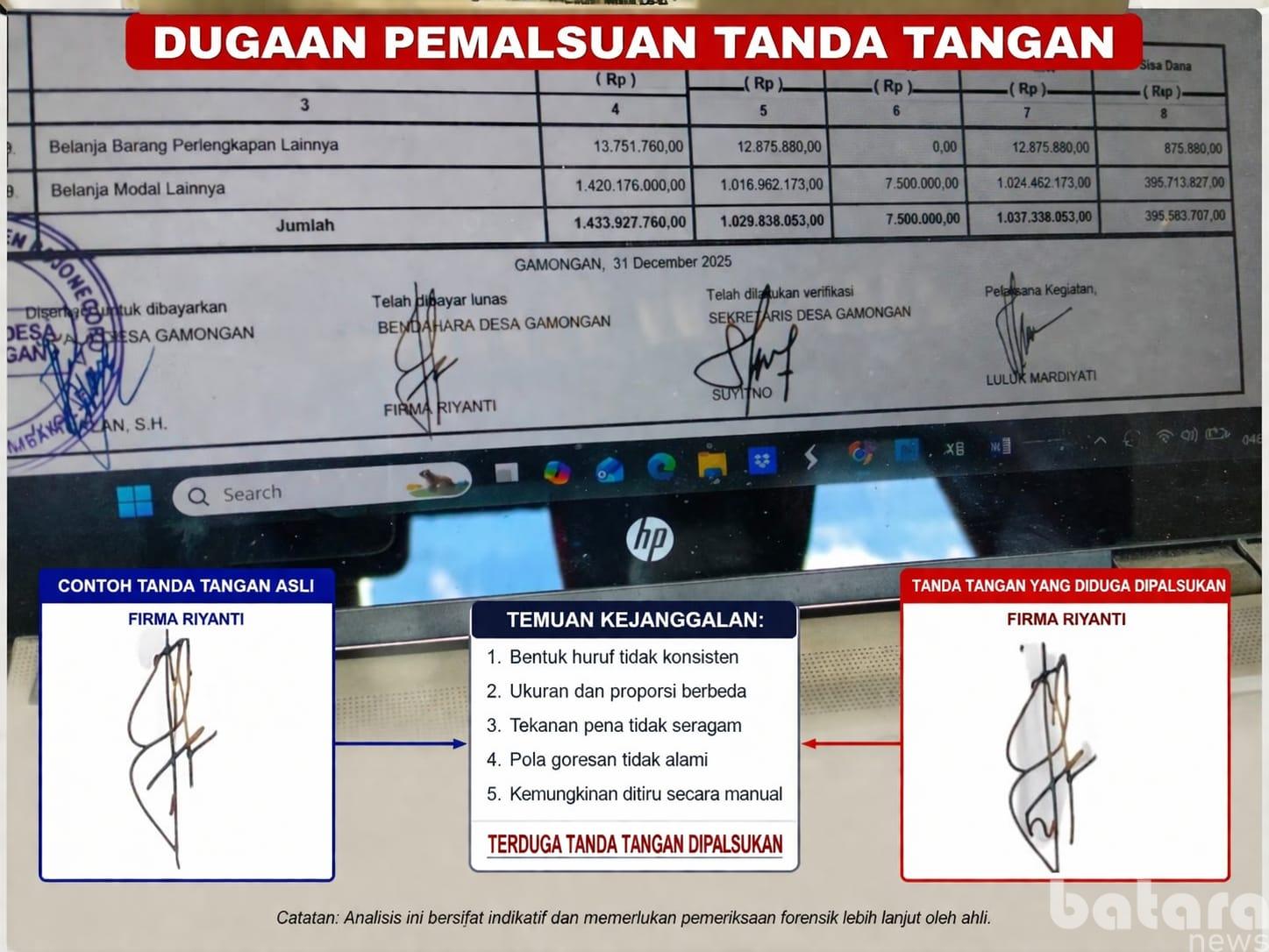 Temuan paling mencolok muncul dari dokumen tertanggal 31 Desember 2025. Dari hasil pembandingan, terdapat perbedaan signifikan antara tanda tangan dalam dokumen tersebut dengan tanda tangan asli pada berkas lain.