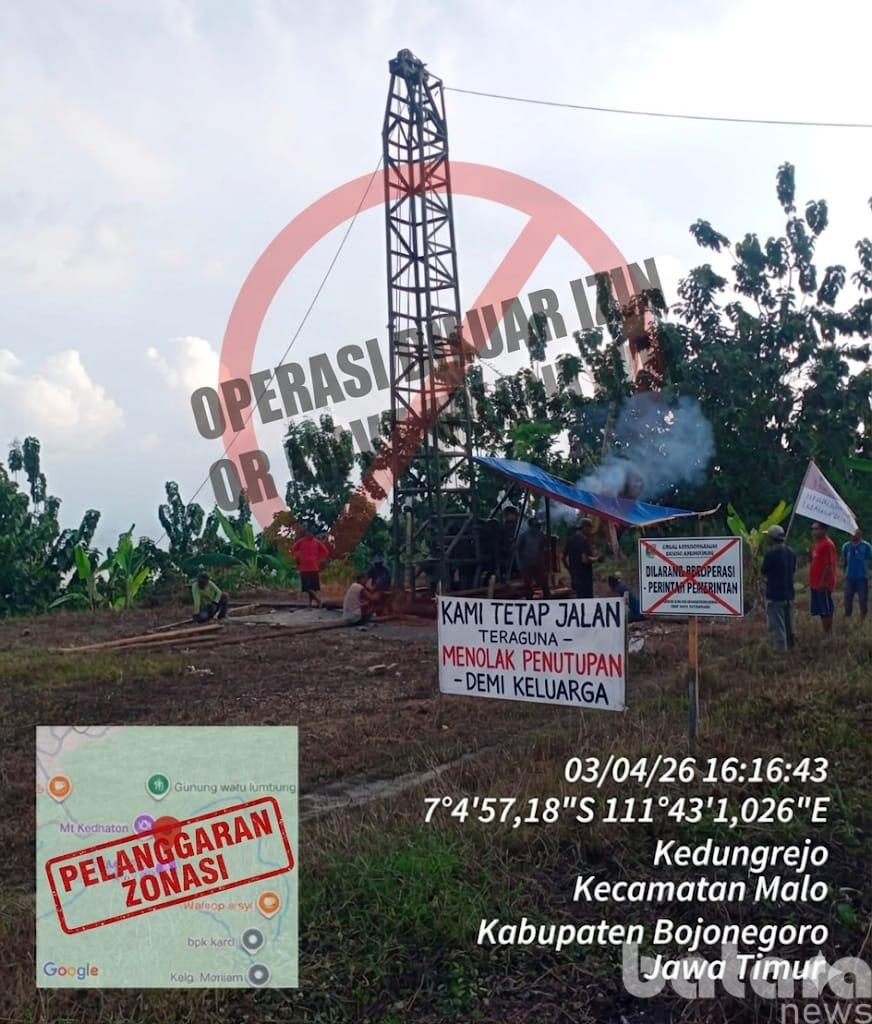 Namun, larangan tersebut seolah diabaikan. Dokumentasi yang dihimpun awak media memperlihatkan peralatan pengeboran sudah terpasang dan siap operasi di lokasi sejak tanggal 3 April 2026, tepatnya pada koordinat 7°4’57,18″S 111°43’1,026″E.