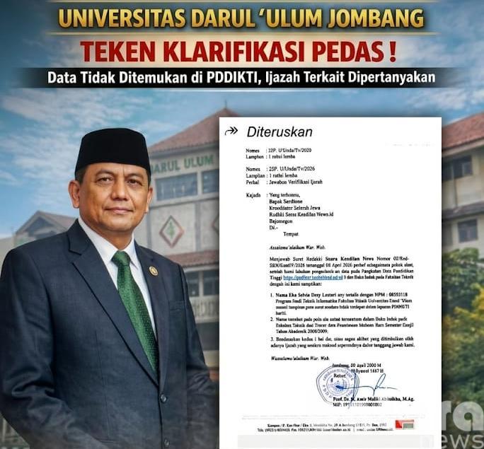 Pasalnya, dalam surat resmi bernomor 288/B/Undar/IV/2026 tertanggal 9 April 2026, pihak kampus memastikan hasil penelusuran data melalui Pangkalan Data Pendidikan Tinggi (PDDIKTI) serta Buku Induk Fakultas Teknik “TIDAK “menemukan nama yang dimaksud.Sabtu(11/4/2026).
