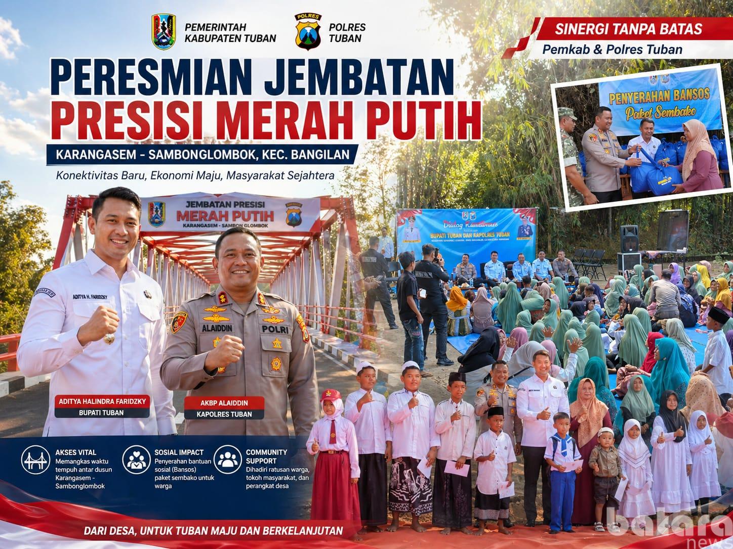 TUBAN – Kolaborasi antara Pemerintah Kabupaten Tuban dan Polres Tuban kembali menghadirkan langkah nyata bagi masyarakat. Bupati Tuban, Aditya Halindra Faridzky, bersama Kapolres Tuban AKBP Alaiddin meresmikan Jembatan Presisi Merah Putih di Kecamatan Bangilan, Rabu (29/4/2026).